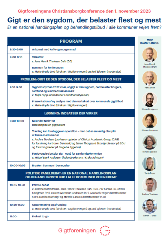 Gigtforeningen afholder en halvdagskonference i Fællessalen på Christiansborg den 1. november 2023 kl. 9.00-11:00. Konferencen har titlen: